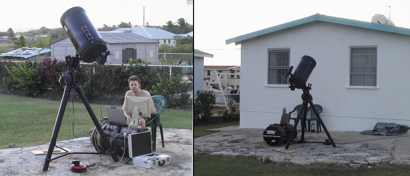Above Left: Myself with C14 at sunset ready to go. Above Right: Set-up facing East showing the house which provided an essential wind break from the ever present easterly trade winds. Note tarp nearby ready to the right for unexpected showers (which occurred on more than on occasion!)