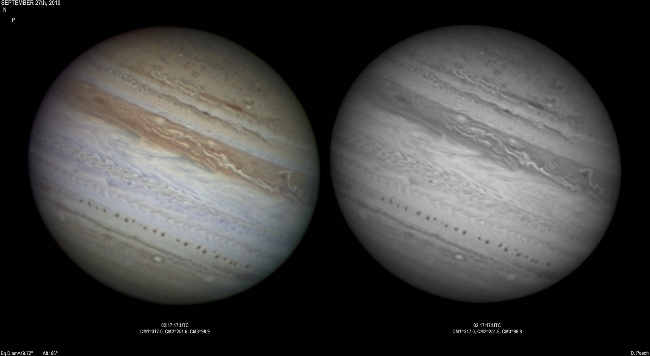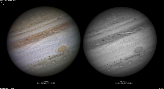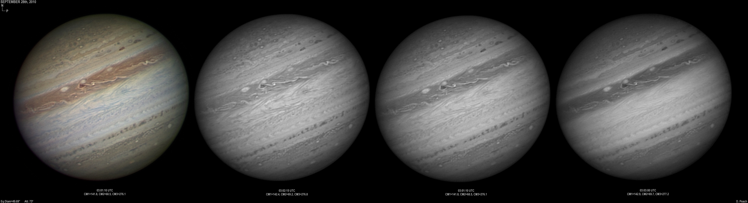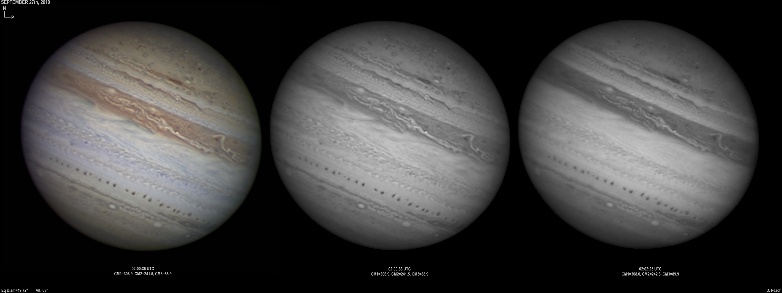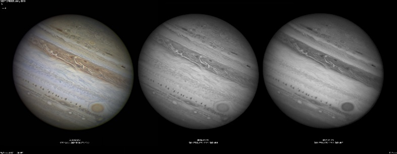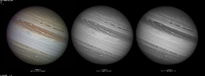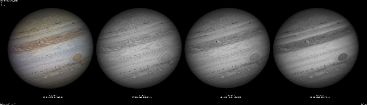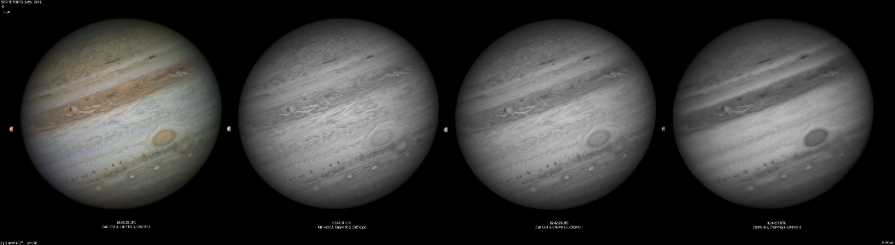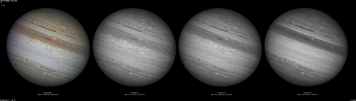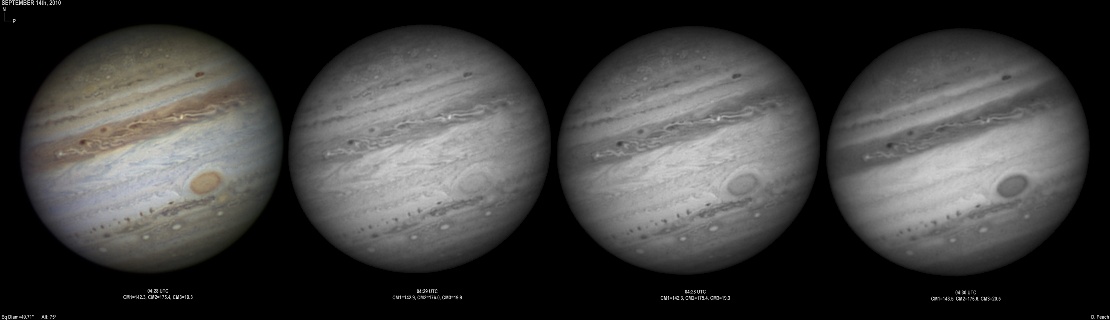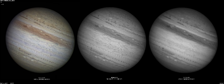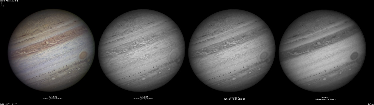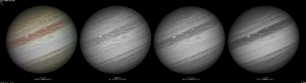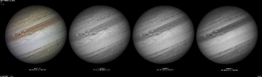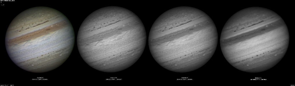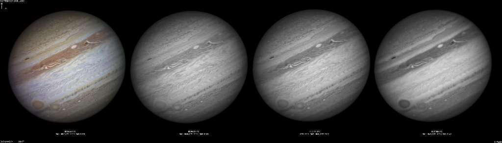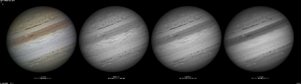 September 14th, 2010. Good seeing though software problems with the Flea3 (which were resolved the next day) meant the SKYnyx camera was used on this night. The GRS and Oval BA are on show, appearing brilliant in the Methane band images with the NNTZ LRS bright in the northern hemisphere.