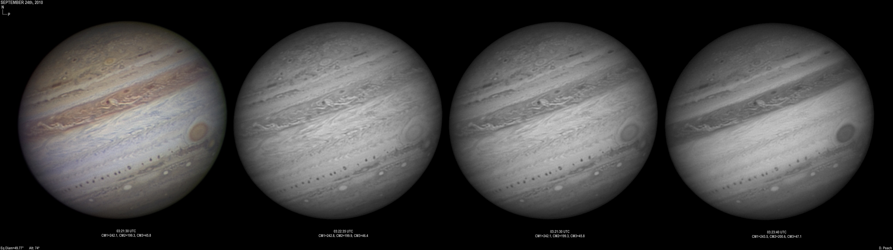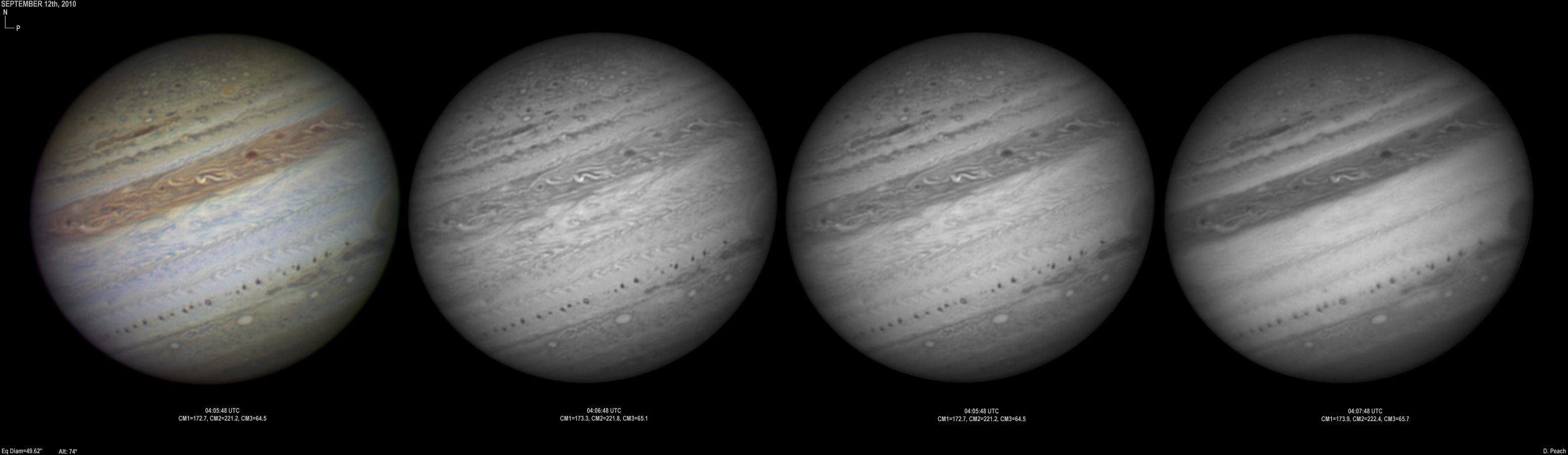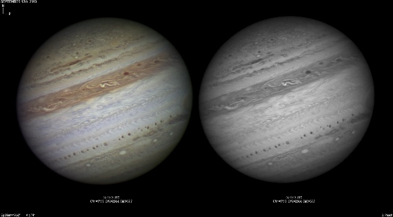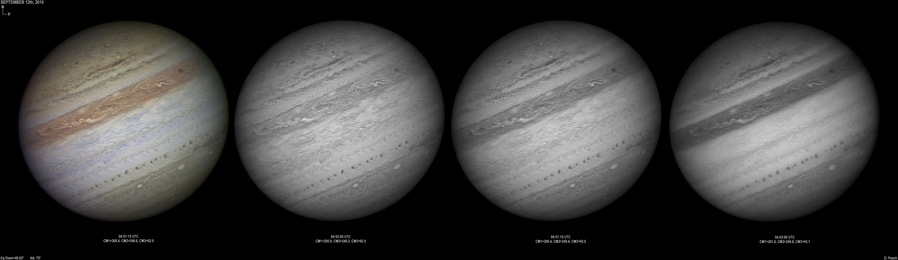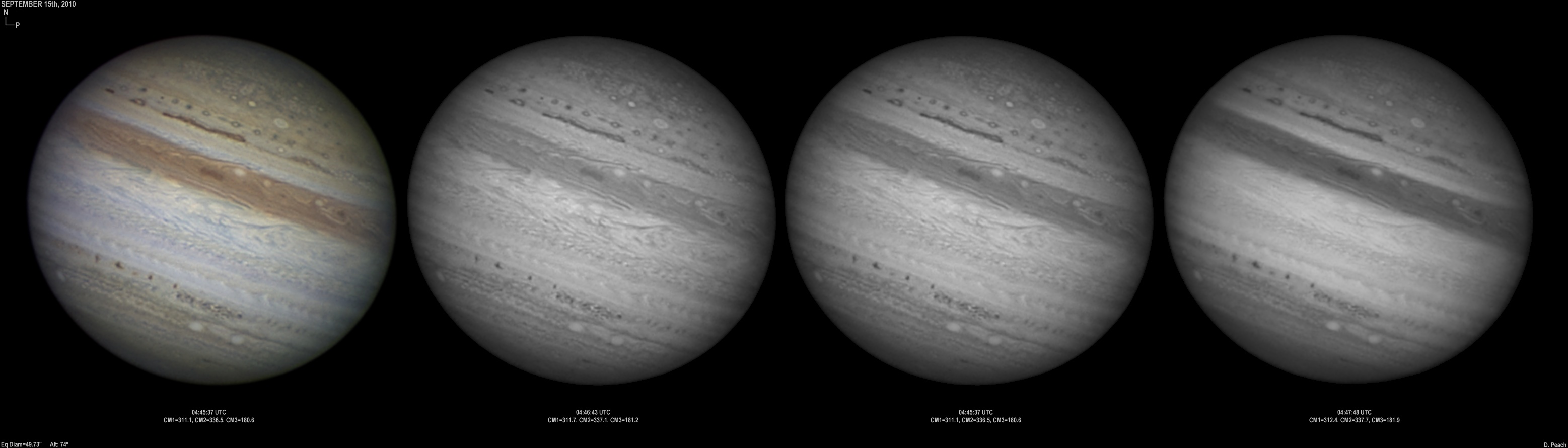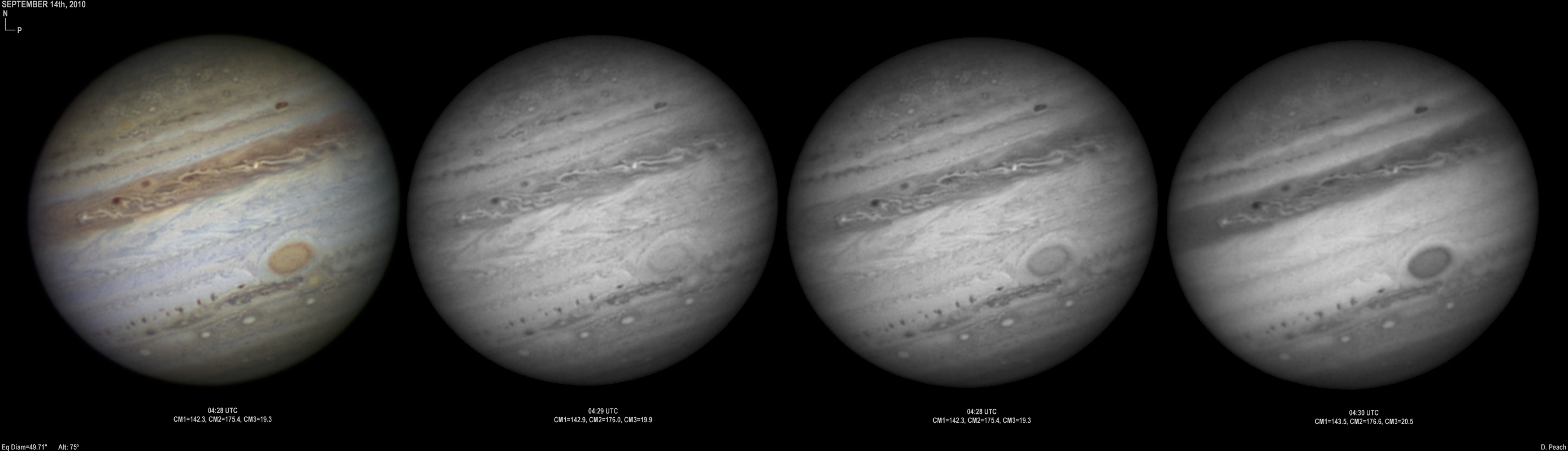 September 14th, 2010. Good seeing though software problems with the Flea3 (which were resolved the next day) meant the SKYnyx camera was used on this night. The GRS and Oval BA are on show, appearing brilliant in the Methane band images with the NNTZ LRS bright in the northern hemisphere.