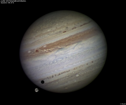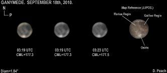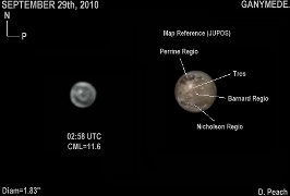 September 18th, 2010. A transit of Ganymede on this night with many of the main features visible on Jupiter's largest Moon such as the brilliant Osiris ray crater region at bottom.