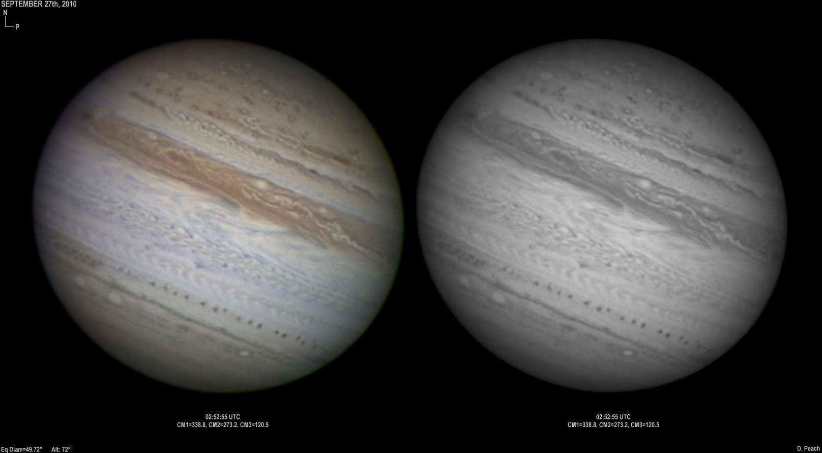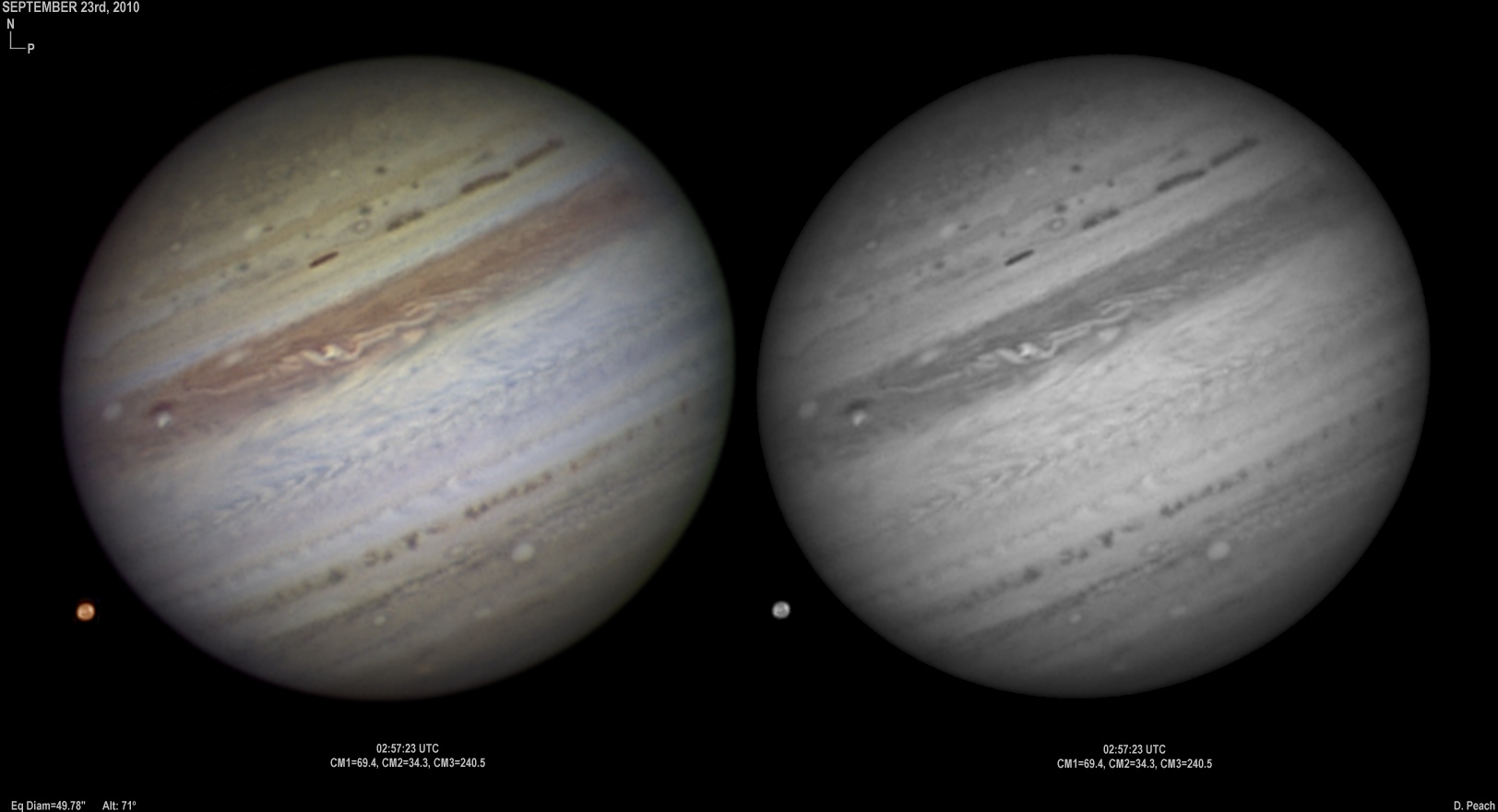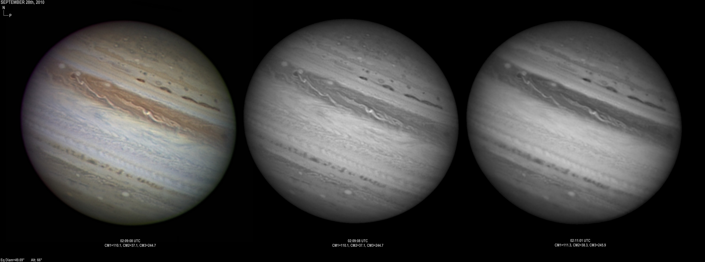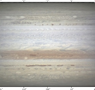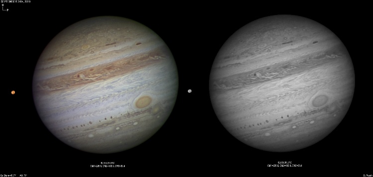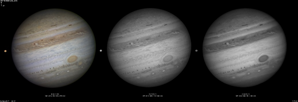 September 25th, 2010. Excellent conditions again. Note the two bright ovals in the NEB are merging. Ganymede showing various features.
