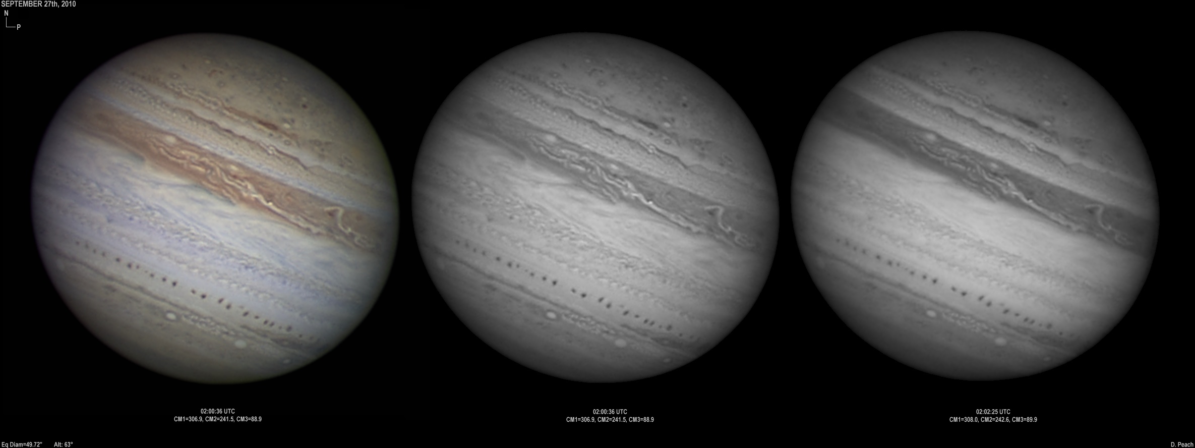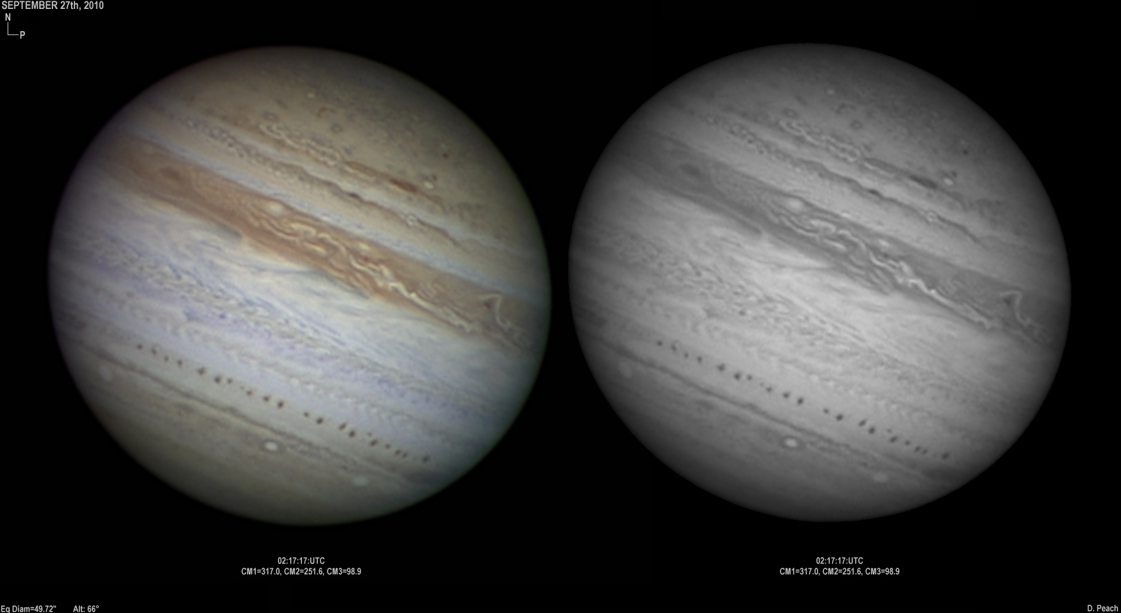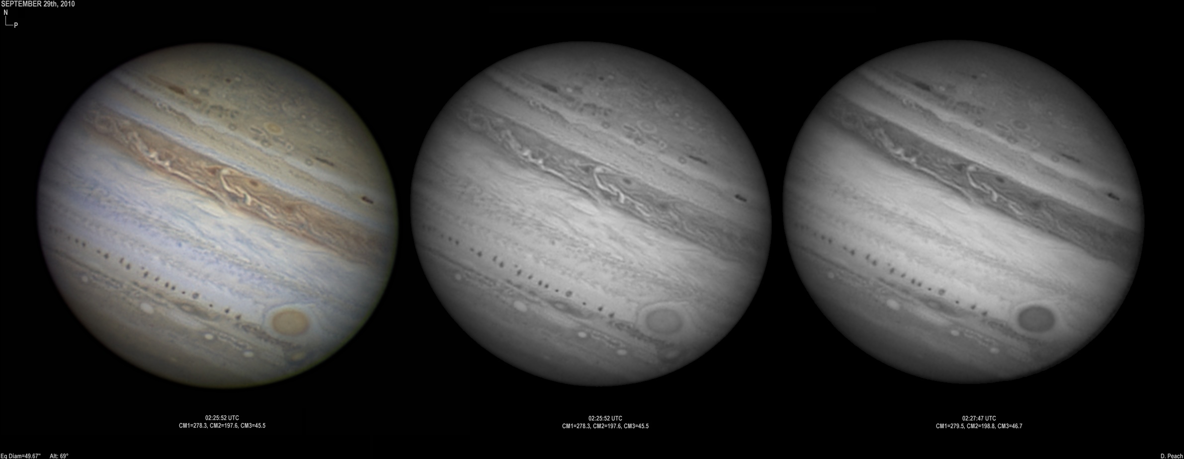 September 25th, 2010. Excellent conditions again. Note the two bright ovals in the NEB are merging. Ganymede showing various features.