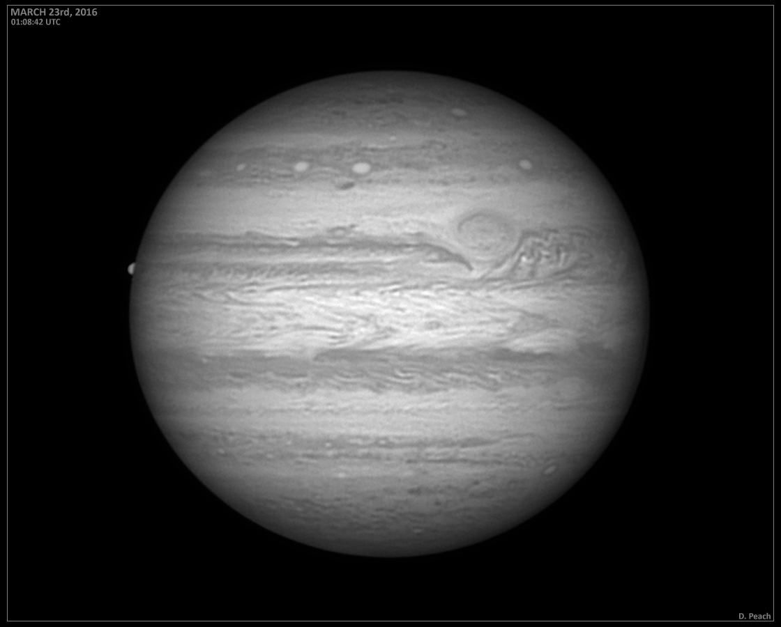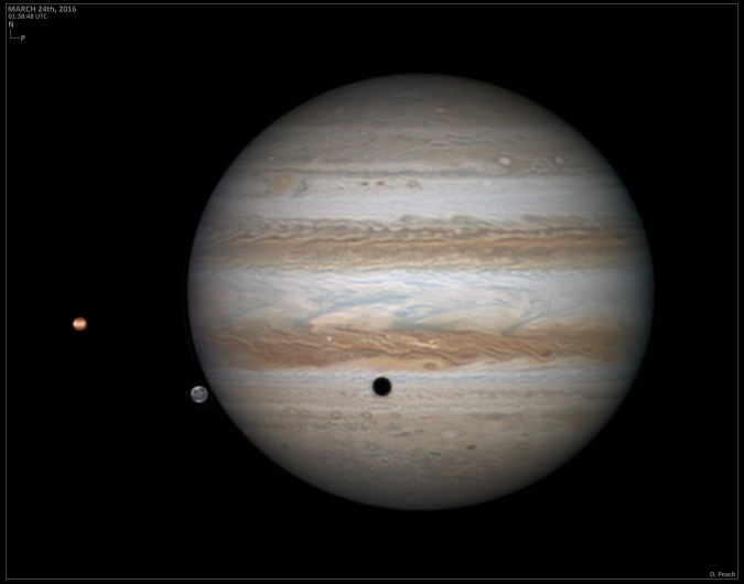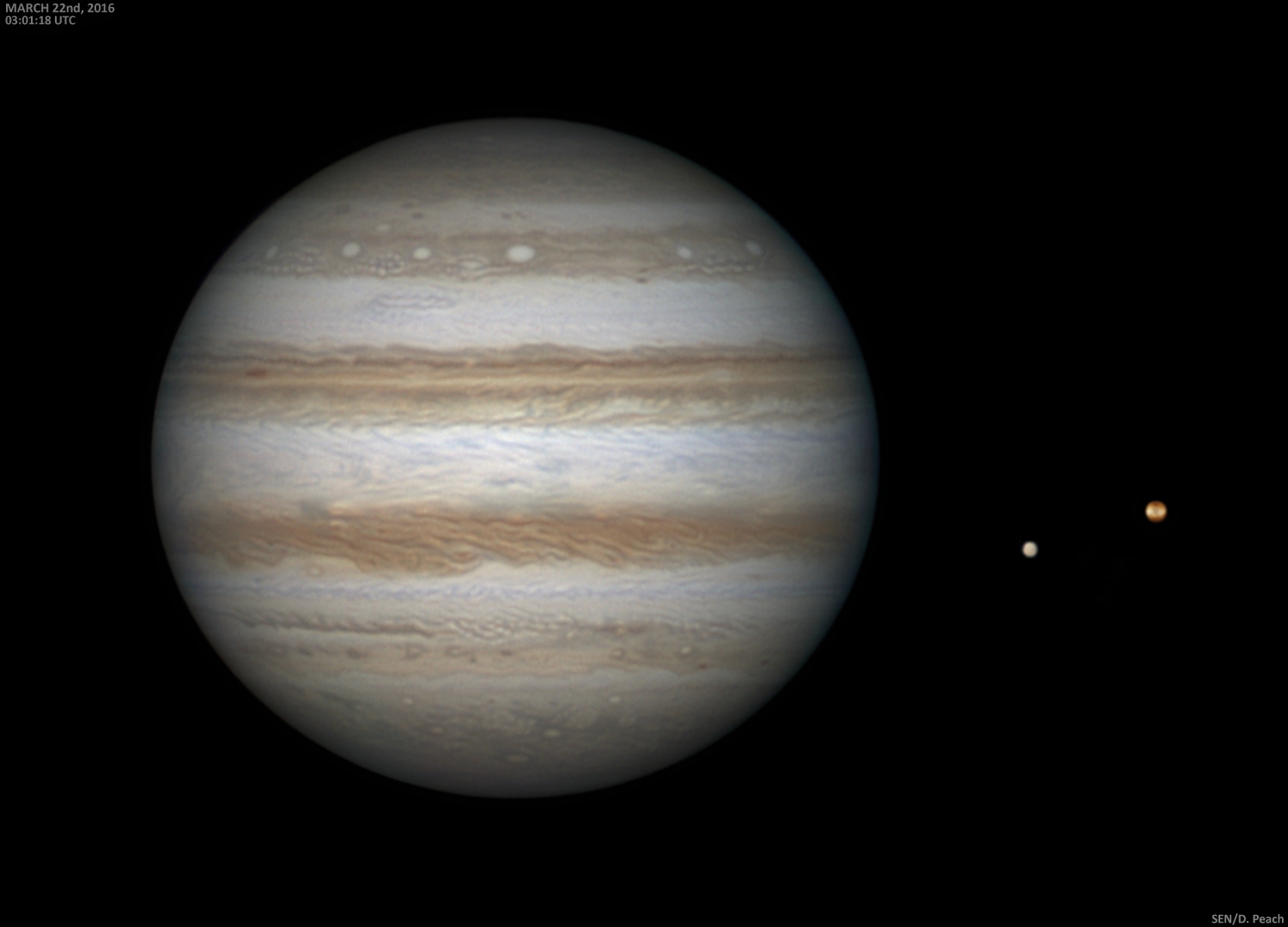Jupiter on March 24th, 2016. Excellent seeing conditions. Ganymede and Io in transit.