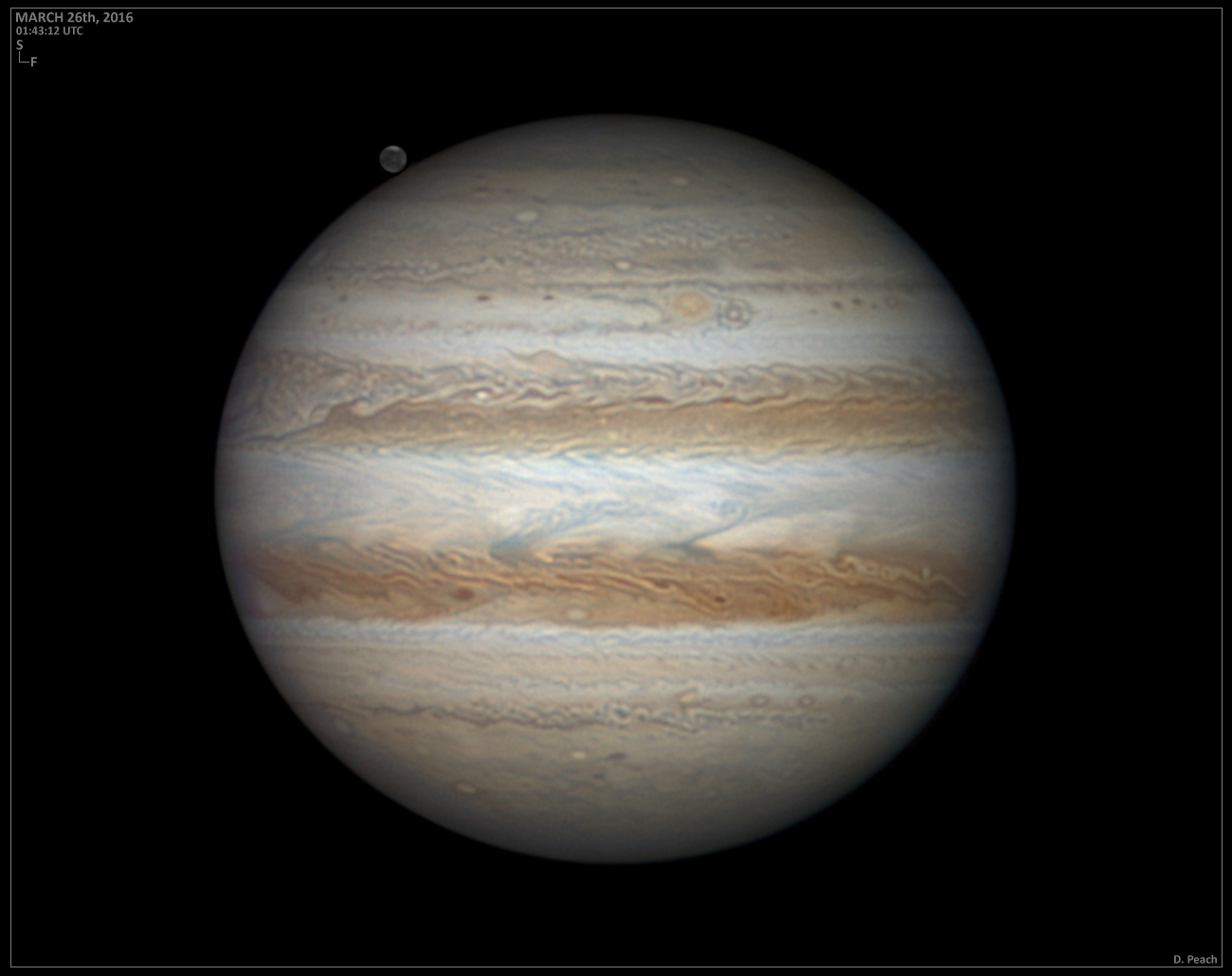 Jupiter on March 26th, 2016. Excellent seeing conditions. Callisto alongside the planet.