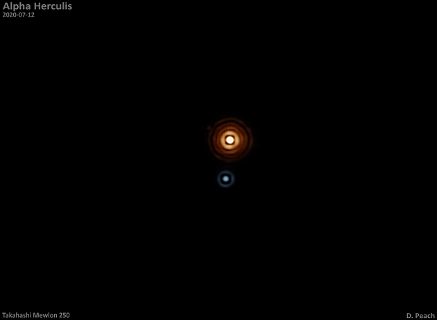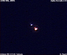Binary System Alpha Herculis. Another very fine pair consisting of a massive red super-giant star, and a small blue companion. Magnitudes 3.5 and 5.4 with a separation of 4.6" arc seconds.
