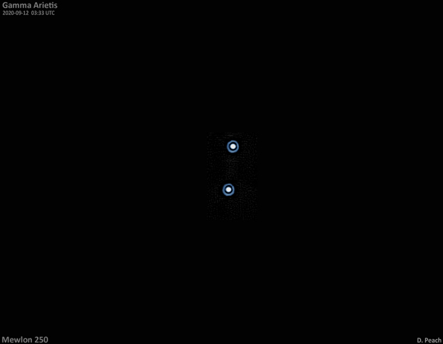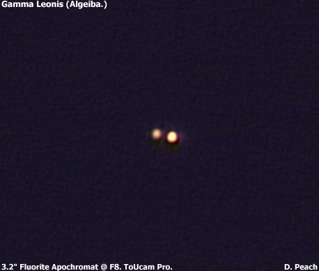 Binary System Gamma Leonis. Another fine colourful pair of an Orange primary and greyish secondary. The magnitudes are 2.2 and 3.5, while the separation is 4.3" arc seconds.