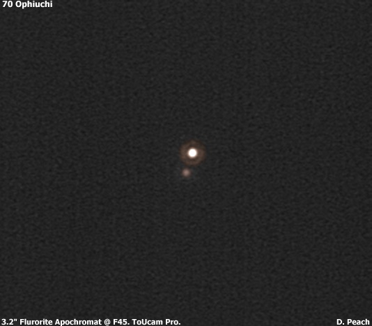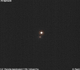 Binary System 70 Ophiuchi. This famous pair has an orbital period of 88yrs. The magnitudes are 4.3 and 6.3, and the current seperation is 4" arc seconds.