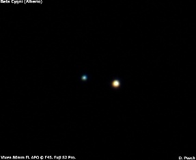 Binary System Beta Cygni. More famously known as Alberio. One of the finest binary systems in the sky, with its golden yellow mag 3.2 primary, and blue mag 5.4 companion. The separation is 34" arc seconds.