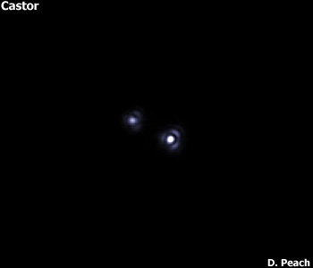 Binary System Alpha Geminorum. Better known as Castor, this bright pair is well seen even in small telescopes. Magnitudes 1.9 and 2.9. The separation is 4" arc seconds.