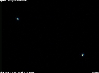 Binary System Epsilon Lyrae 1 & 2. More famously known as the "double double", this quadruple system is a fine sight in telescopes of 3" and larger. The wider view shows both pairs while the close-up shows Epsilon 2 Lyrae. Both pairs are separated by 208", while the closer pairs are just 2.6" and 2.3" arc seconds separation.