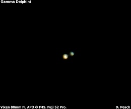 Binary System Gamma Delphini. A splendid yellow pair of stars of magnitudes 4.5 and 5.5. The separation is 9.5" arc seconds.