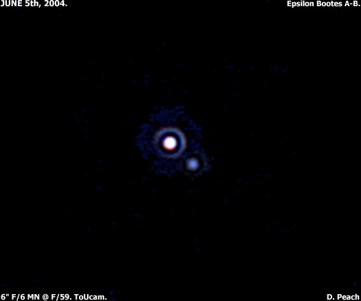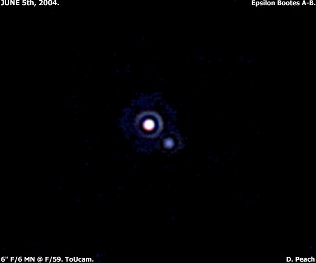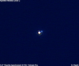 Binary System Epsilon Bootes. Better known as Izar or, as Struve called it "Pulcherima" - the most beautiful. The fine pair of an Orange primary and blue secondary can be seen well in small telescopes. The magnitudes are 2.7 and 5.1, while the seperation is 3" arc seconds. The above images show the views in a 6" aperture telescope at left, and 3.2" aperture telescope at right.