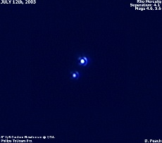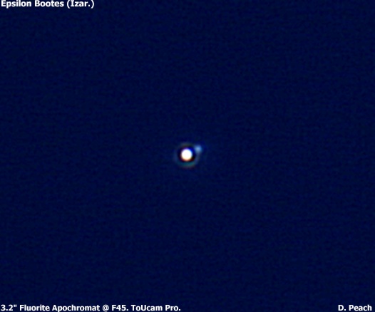 Gamma Virginis. Seen here in 2005 during when the two components of this system passed through thier closest. The seperation is around 0.35" arc seconds. These images taken using a 9.25" telescope clearly show the elongated pair. The multi-spectral set clearly shows that the resolving power of the telescope is better at short wavelengths.