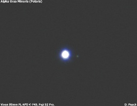 Double System Alpha Ursa Minoris. Better known as Polaris, the double consists of the bright magnitude 2.1 primary and an optical 9.1 secondary 18" arc seconds away.