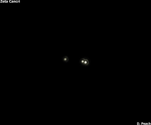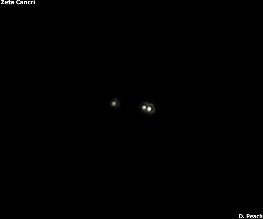Binary System Zeta Cancri. A well known triple system. The wider pair are separated by 6" arc seconds, but the bright star is itself a much closer system, with a sixty year period. The separation is currently 0.8" arc seconds.