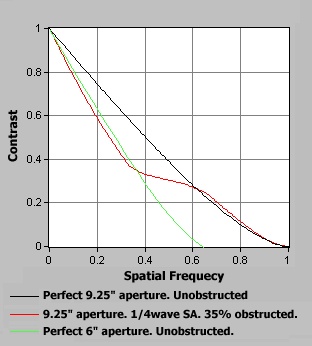 The green line shows a perfect, unobstructed 6” (15cm) aperture. We can see