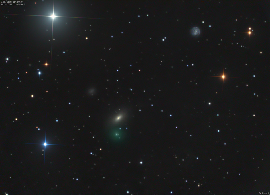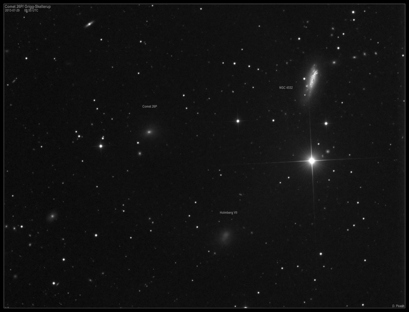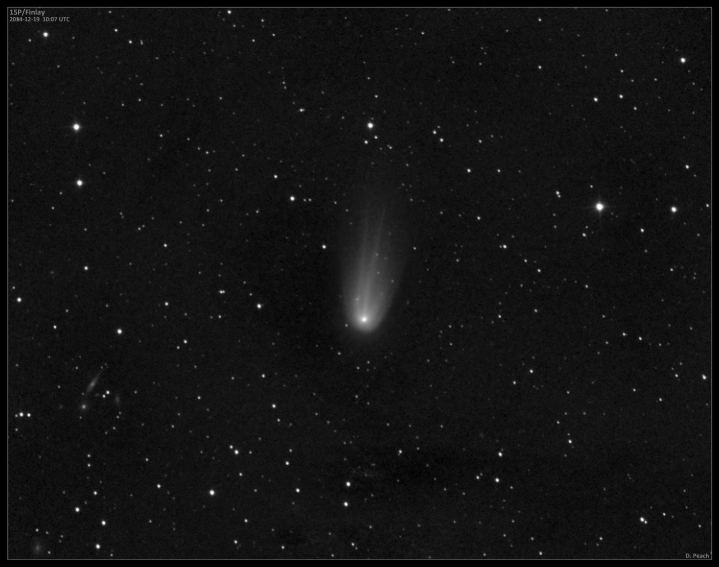 Discovered in 1902 by John Grigg of New Zealand, and rediscovered in its next appearance in 1922 by John Francis Skjellerup. It has an orbital period of just over 5 years and was visited by the Giotto probe in 1992. Seen above it appears near two interesting galaxies.