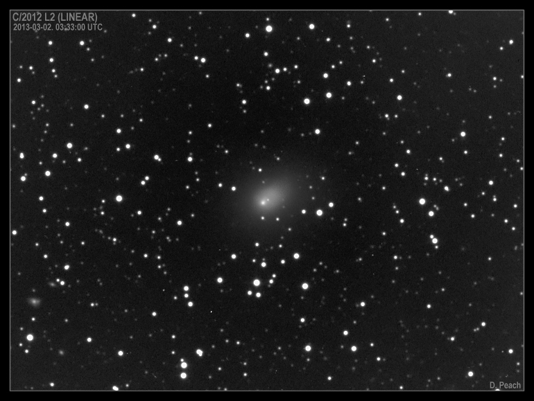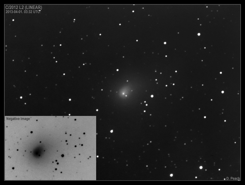 Comet C/2012 L2 (LINEAR) 17" F4.5 Planewave CDK. FLI CCD camera. 6 x 2mins. March 2nd, and April 1st, 2013.
