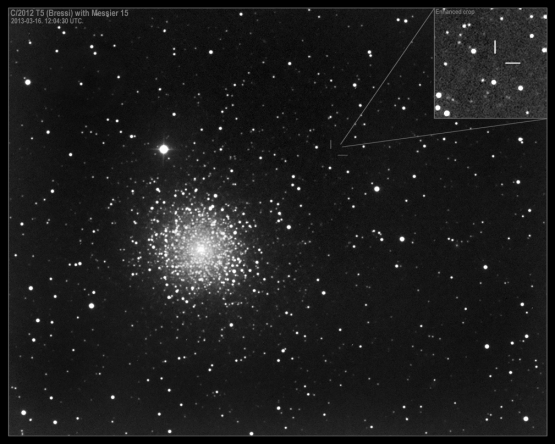 Discovered on October 14th, 2012 using the 90cm Spacewatch telescope at Kitt Peak. The comet underwent an outburst in January and brightend to 9th magnitude however it rapidly faded after passing Perhelion on Feb 24th and by the time of the image on March 16th (above) it had faded to become extremely faint (18th magnitude or fainter) while passing globular cluster M15 in Pegasus.