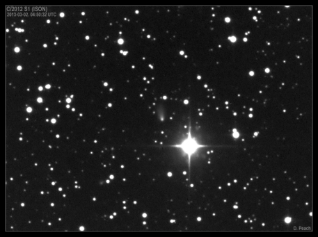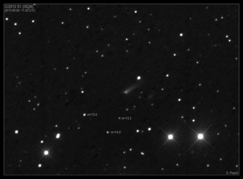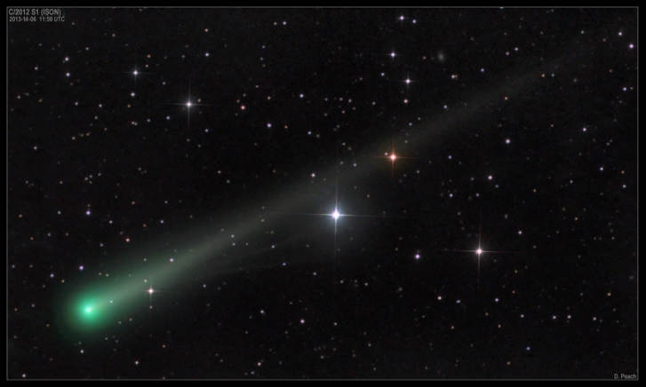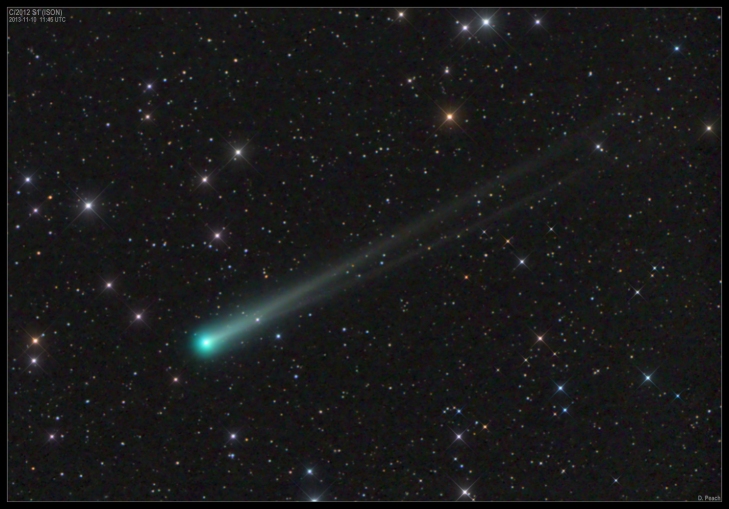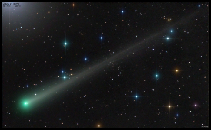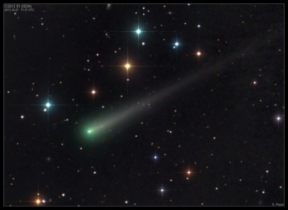 C/2012 S1, also known as Comet ISON or Comet Nevski–Novichonok, is a sungrazing comet discovered on 21 September 2012 by Vitali Nevski (Vitebsk, Belarus) and Artyom Novichonok (Kondopoga, Russia) The discovery was made using the 0.4-meter (16 in) reflector of the International Scientific Optical Network near Kislovodsk, Russia and the automated asteroid-discovery program CoLiTec. The discovery was announced by the Minor Planet Center on 24 September. Observations by SWIFT suggest that C/2012 S1's nucleus is around 5 kilometers (3.1 mi) in diameter.