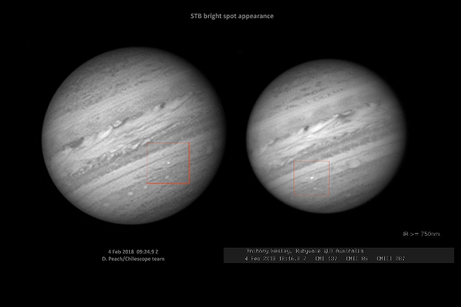 Jupiter on February 4th, 2018. Good seeing conditions. A brilliant new storm outbreak is visible within the STB (small bright spot upper centre.) 1m telescope with ASI174MM.