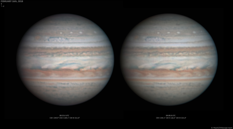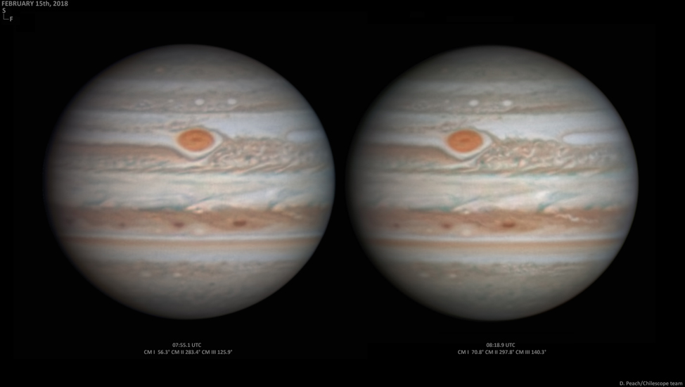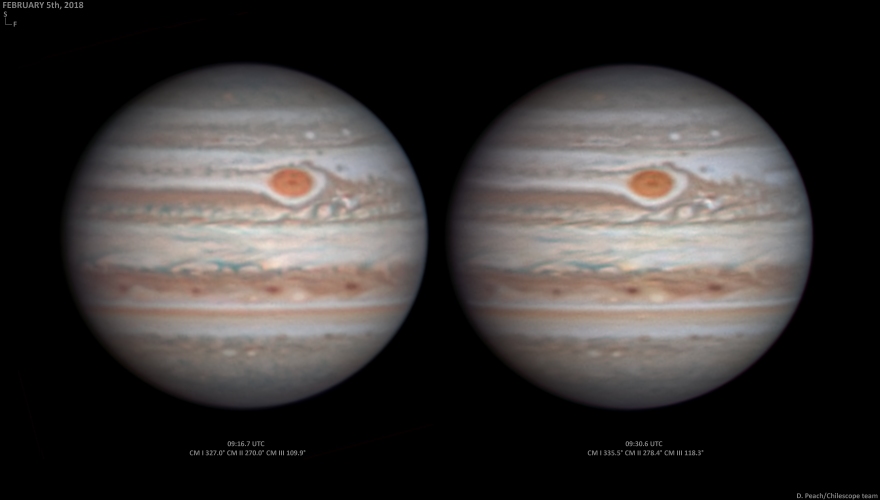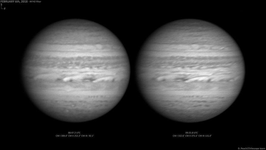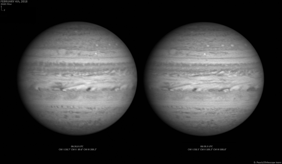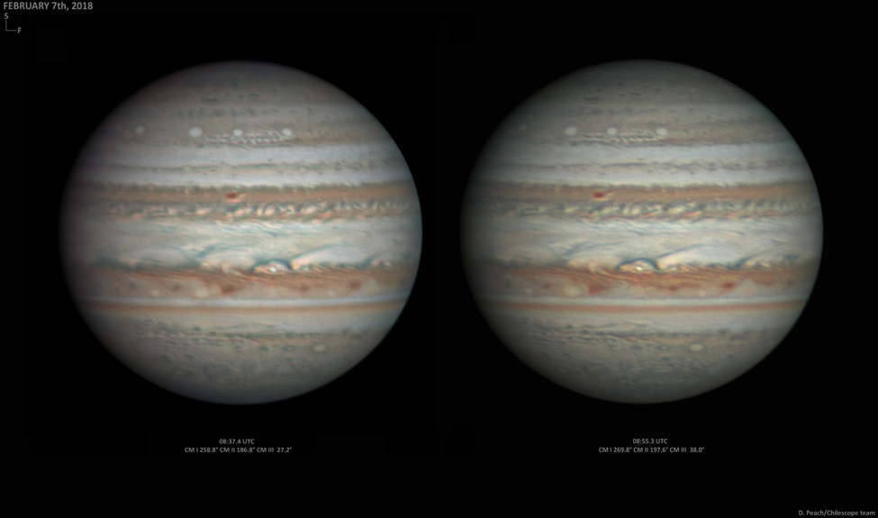 Jupiter on February 13th, 2018. Good seeing conditions. Europa is seen alongside and also in transit. Oval BA well seen in the right hand image. 1m telescope with ASI174MM.