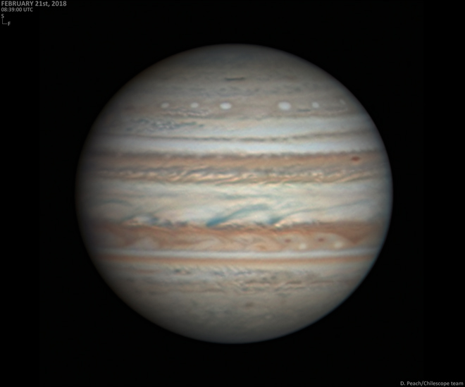 Jupiter on February 4th, 2018. Good seeing conditions. A brilliant new storm outbreak is visible within the STB (small bright spot upper left.) 1m telescope with ASI174MM.