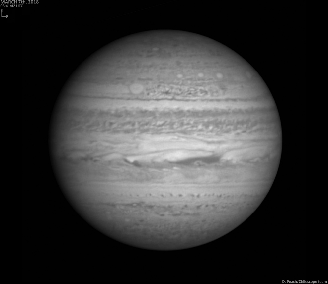 Jupiter on March 7th, 2018. Good seeing conditions. Oval BA and the STB outbreak are well seen in this near IR view . 1m telescope with ASI174MM.