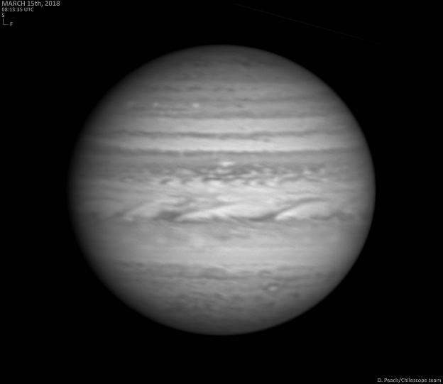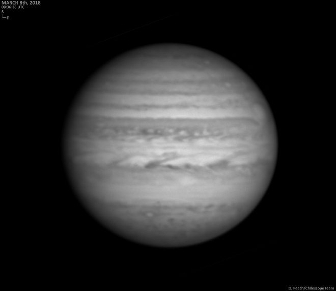 Jupiter on March 8th, 2018. Poor seeing conditions. GRS just appearing at right. 1m telescope with ASI174MM.