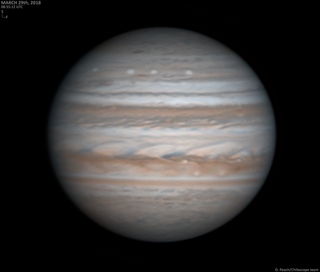 Jupiter on March 31st, 2018. Excellent seeing conditions. A wealth of details visible across the disk. Oval BA is prominent lower centre. 1m telescope with ASI174MM.