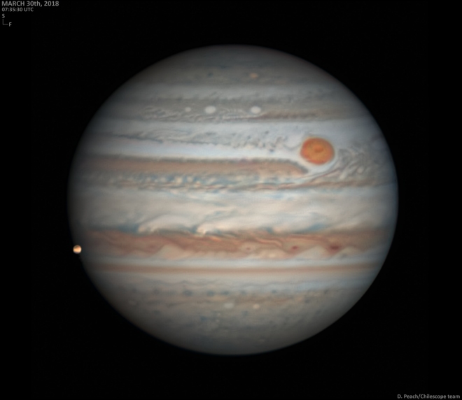 Jupiter on March 30th, 2018. Good seeing conditions. GRS and STrD well seen. Io alongside the planet. 1m telescope with ASI174MM.