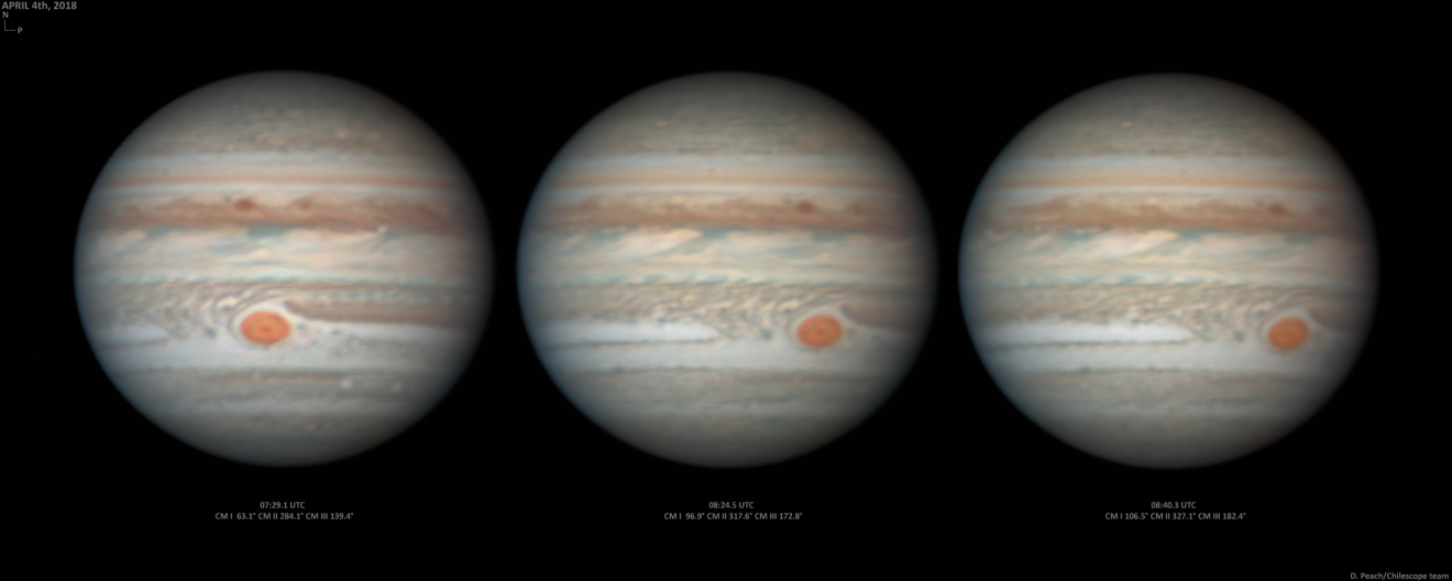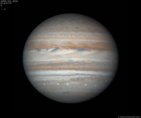 Jupiter on April 4th, 2018. Poor seeing conditions. GRS and STrD well seen. 1m telescope with ASI174MM.