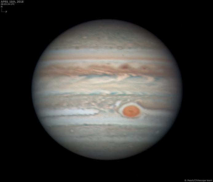 Jupiter on April 16th, 2018. Fair seeing conditions. GRS and STrD well seen. 1m telescope with ASI174MM.
