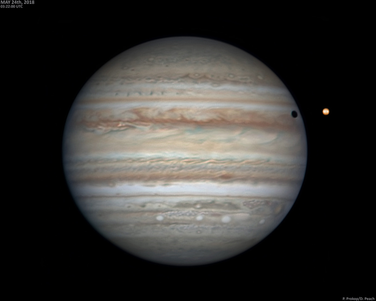 Jupiter on May 8th, 2018. Excellent seeing conditions. GRS just appearing at left. Io and shadow in transit. C14 with ASI290MM.