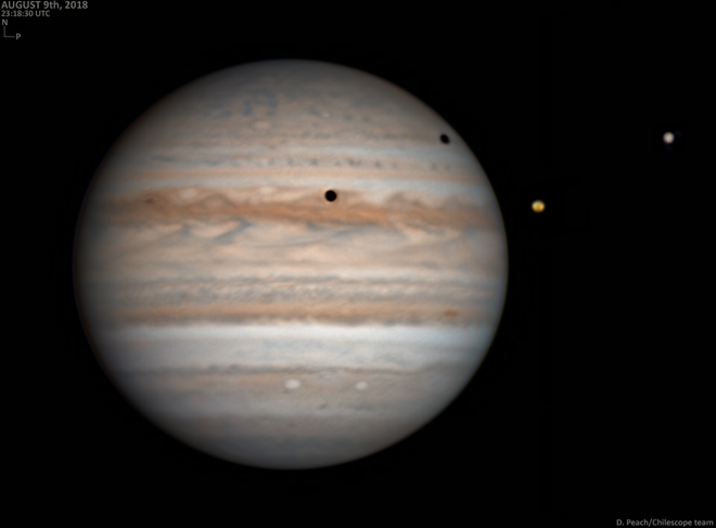 Jupiter on August 9th, 2018. Fair seeing conditions. Io and Europa shadow transit early in the session. 1m telescope with ASI174MM.