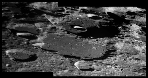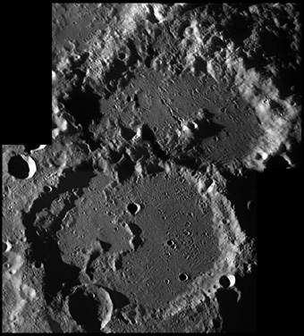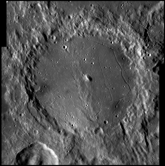 The interior floor of Vlacq crater has been resurfaced by lava, leaving a nearly level base. The southwest half of the floor, however, is overlaid by ejecta from nearby impacts. In the mid-point of the floor is a rounded massif that is about 15 kilometers in length, being long along the northwest direction. The floor contains a number of tiny craterlets as well as several ghostly crater remnants in the western half. The most notable of these is a circular depression to the west of the central peak. 2005/11/20. C14 @ F41. LU075M.