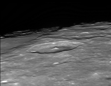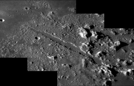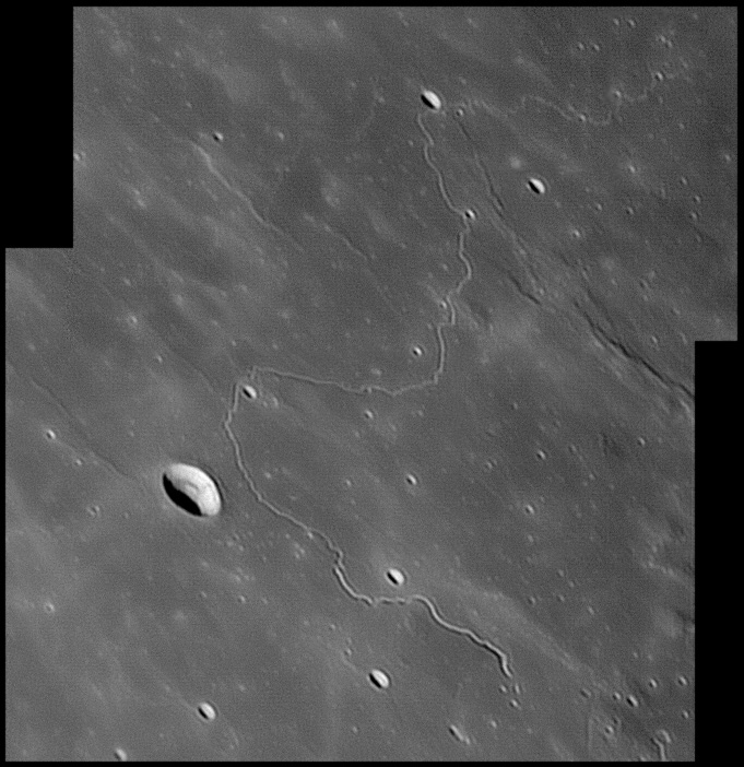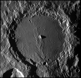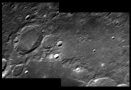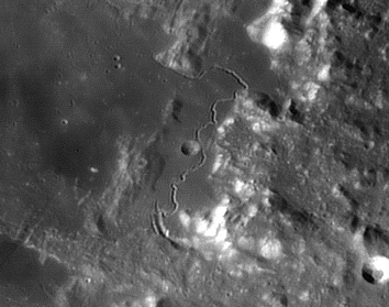 Darwin Rimae. Parts of the interior floor of Darwin crater have been resurfaced, possibly by lava or fall-back ejecta, and a system of rilles cut across the northern part of the floor, crossing the eastern rim and continuing to the southeast. These rilles stretch for a distance of about 280 kilometers. To the east of Darwin, this system of rilles crosses Rima Sirsalis, a wide rille that follows a line to the northeast. 2006/04/12. C14 @ F41. LU075M.