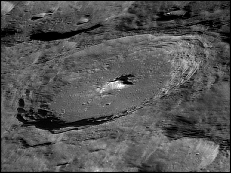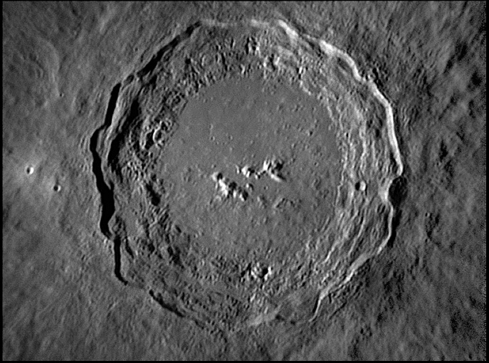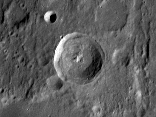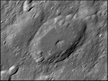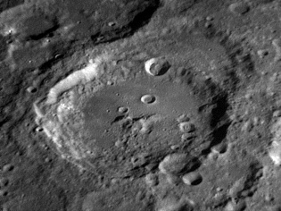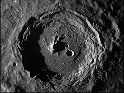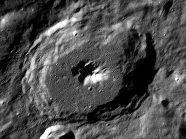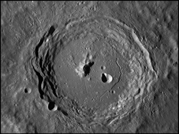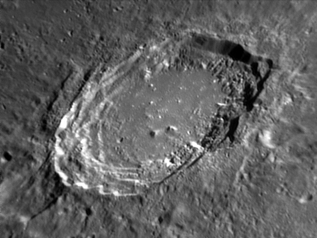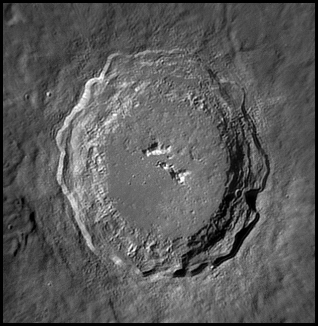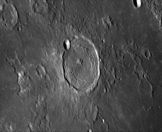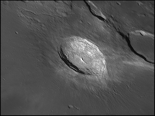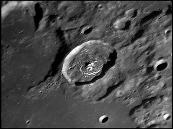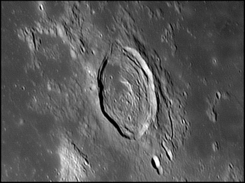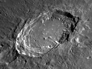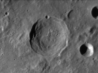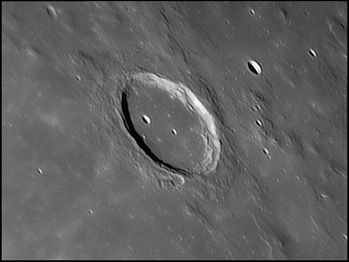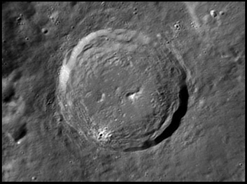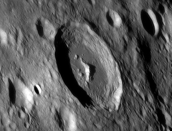 The crater interior has a relatively high albedo, making it a prominent feature when the Moon is nearly full. (The high latitude of the crater means that the Sun always remains close to the horizon even at maximum elevation less than a day after Full Moon.) The interior walls are steep and possess a system of terraces. The central peak is offset from the crater mid-point, and joins a low range across the crater floor. 2006/04/18. C14 @ F41. LU075M.