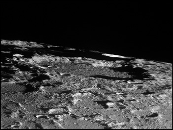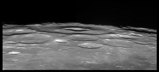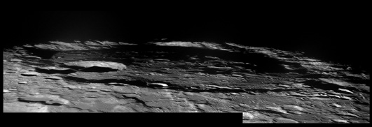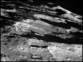 Bailly's uneven crater floor has remained free of lava flooding, and it is covered with a multitude of ridges and craters. The entire crater has been battered and worn, and the outer ramparts are eroded and in some places have even been worn away by myriad impacts. If the crater ever possessed a central peak, it is no longer discernable. Due to its current condition, observers have termed this feature a 'field of ruins'. Due to the size and the worn state of this crater, it is estimated to be more than 3 billion years old. 2006/04/12. C14 @ F41. LU075M.