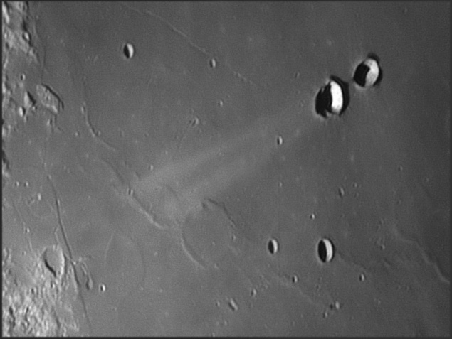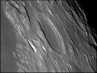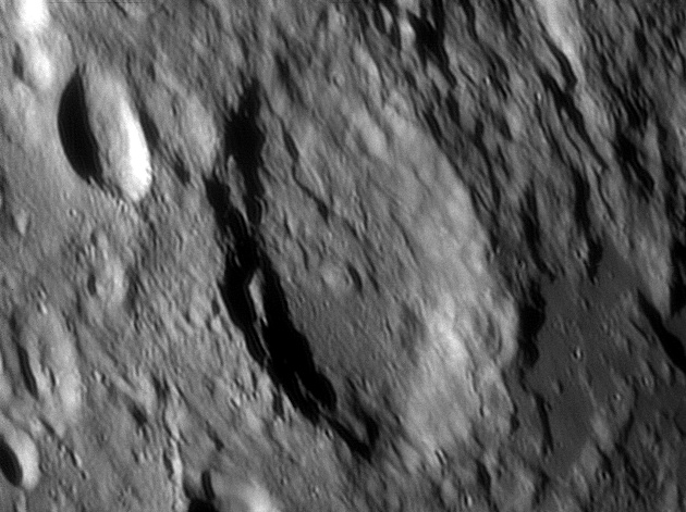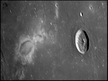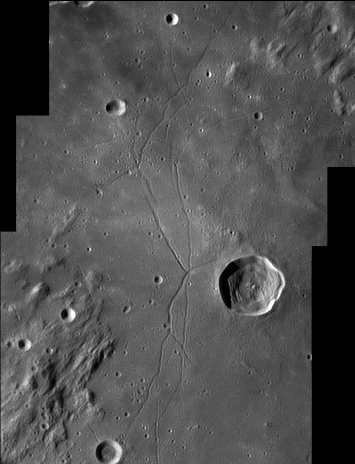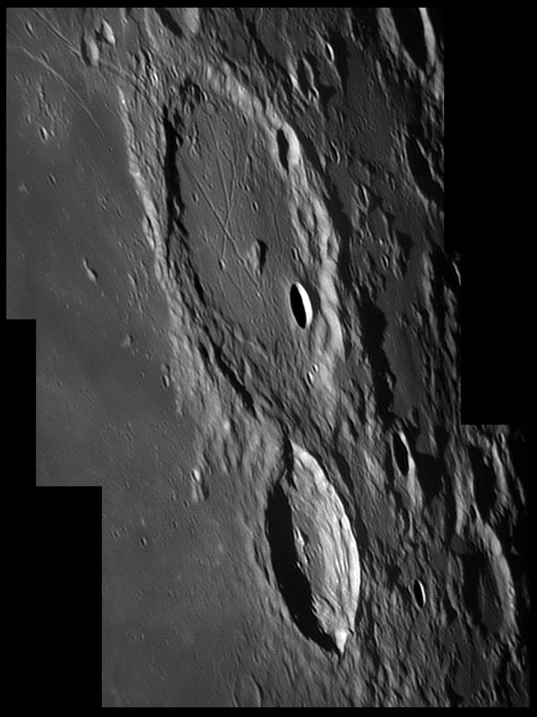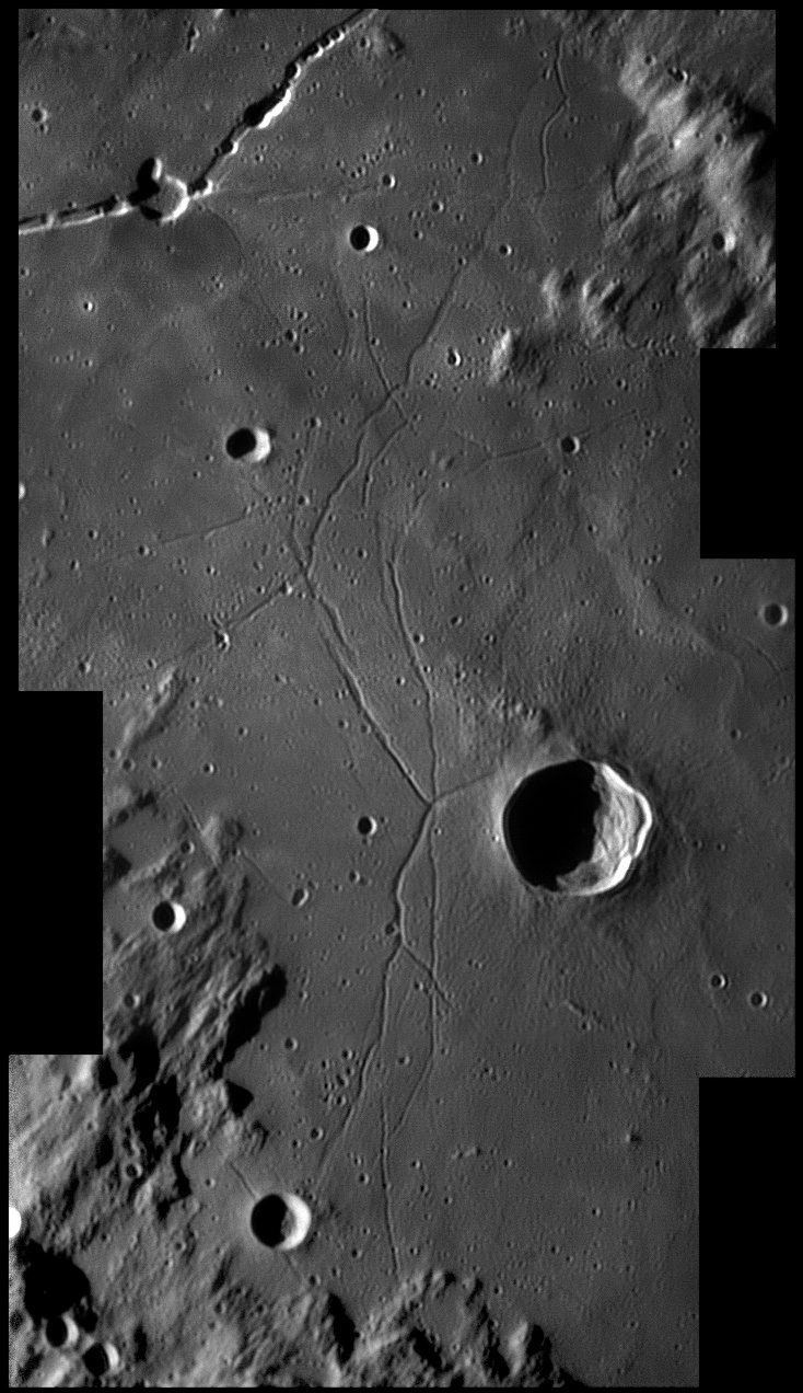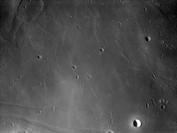 On either of this crater are a linear, irregular gashes in the lunar surface, forming valley-like features. These features are approximately parallel to each other and radiate from the direction of Mare Imbrium to the north-northwest. 2006/04/20. C14 @ F41. LU075M.
