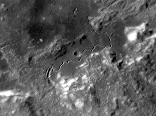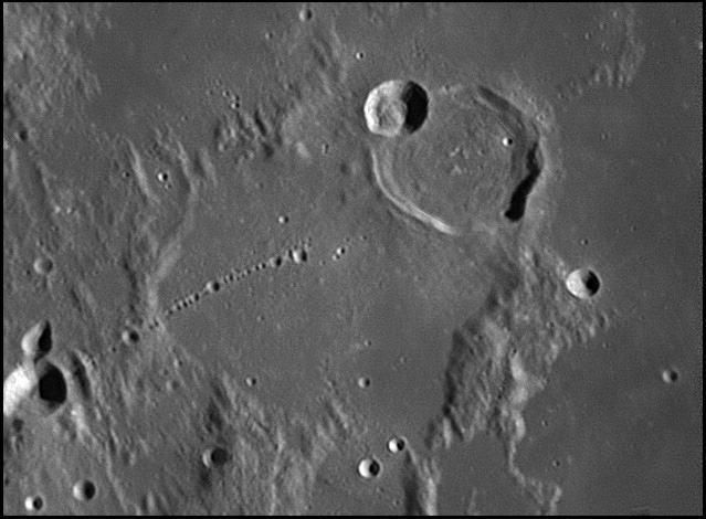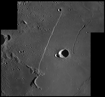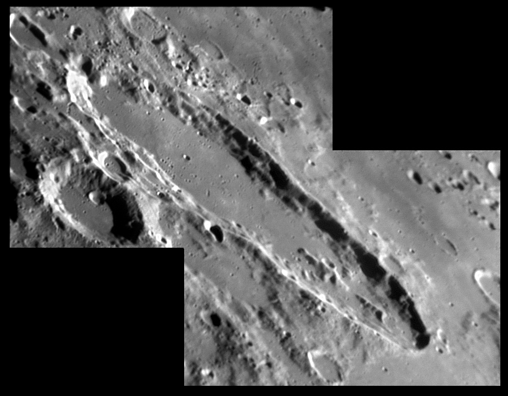 The origins of this valley are believed to be volcanic. The interior floor has been resurfaced and is very level. However there is a slender rille located on the floor visible in large telescopes. 2006/04/21 & 2006/11/04. C14 @ F41. LU075M.