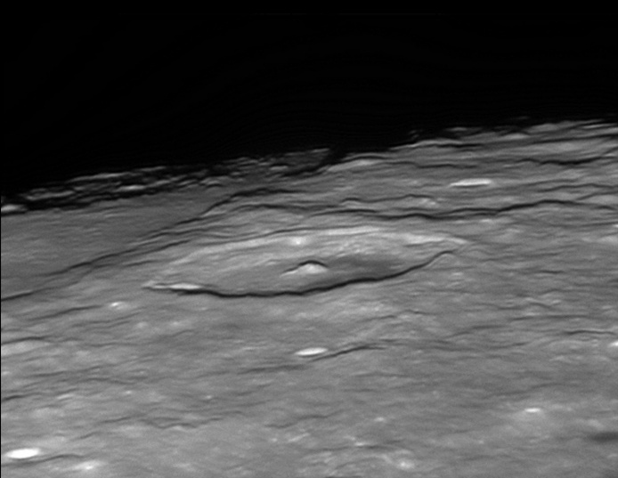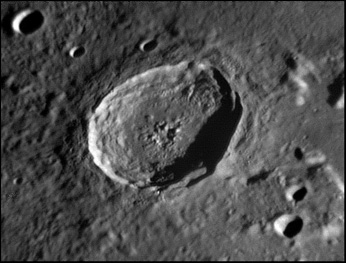 Pythagoras is a prominent lunar impact crater located near the northwestern lunar limb. The crater has an oval appearance due to the oblique viewing angle. The well-preserved rim of Pythagoras crater has a wide terrace system, and a slight rampart around the exterior. Although generally circular, observers note that the crater outline has a hexagonal form. The floor is flattened, but with an irregular, hilly surface. There is evidence of landslips around the periphery. In the center is a sharp, moutainous rise with a double-peak that ascends 1.5 kilometers above the crater floor. 2006/04/21. C14 @ F41. LU075M.