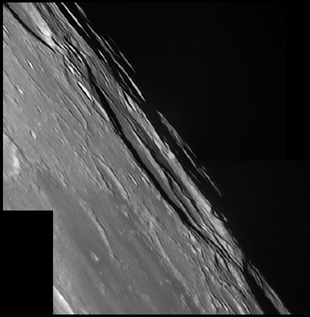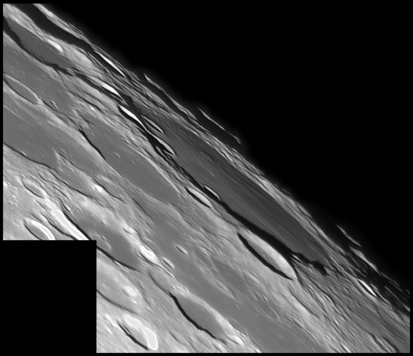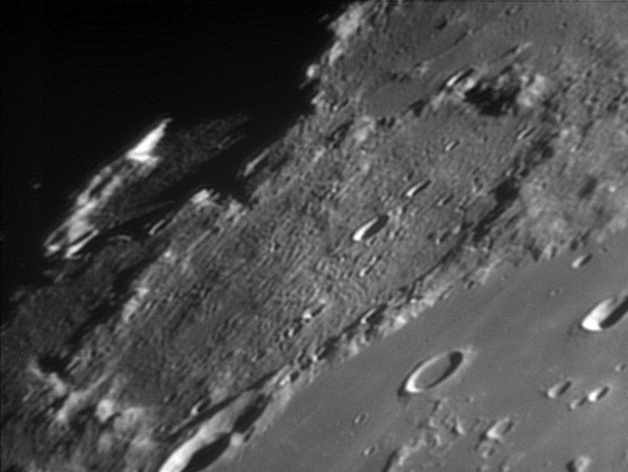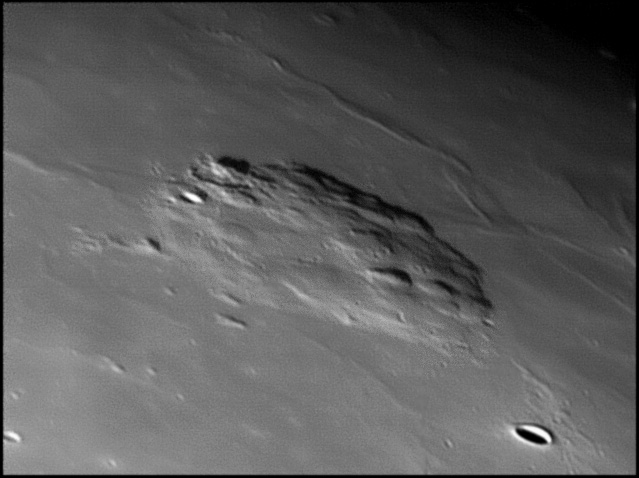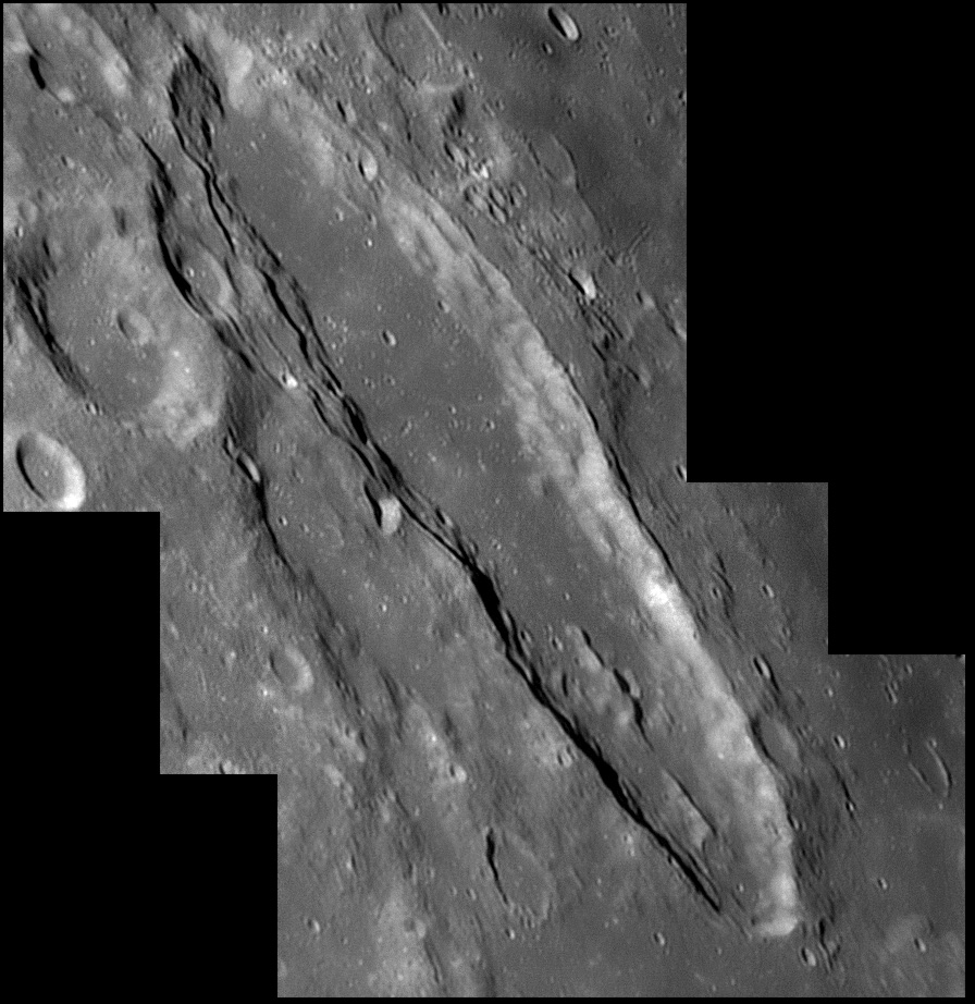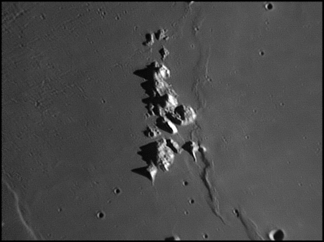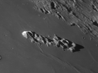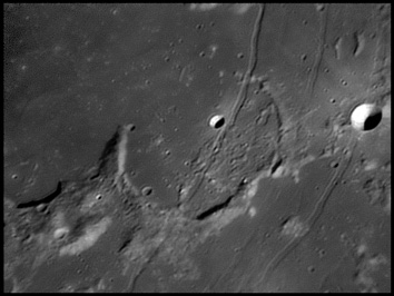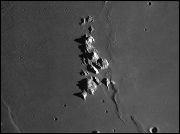 To the west of this escarpment is the Birt crater, which is about 10.5 miles in diameter. Also to the west is the Rima Birt rille. At the southern end is a group of hills often called the "Stag's-Horn Mountains", although this name is not officially recognized by the IAU. 2006/04/20 & 2006/10/14. C14 @ F41. LU075M.