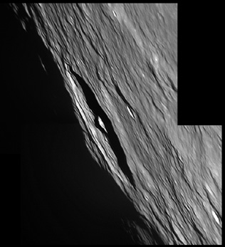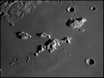 The floor of the Vallis Alpes is a flat, lava-flooded surface that is bisected by a very narrow, cleft-like rille. (This cleft is a well known and challenging target for telescopic observation from the Earth.) The sides of the valley rise from the floor to the surrounding highland terrain, a blocky, irregular surface. The southern face of the valley is straighter than the northern side, which is slightly bowed and uneven. The more rugged edges of the valley lie at the narrow west-southwest end that cuts through the mountain range. Most likely this valley is a graben that was subsequently flooded with magma. This valley was discovered in 1727 by Francesco Bianchini. 2006/04/19. 2007/03/26 C14 @ F41. LU075M.