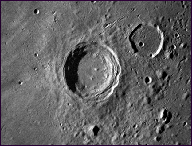 Rheita & Rheita E. Rheita is an impact crater located in the southwestern sector of the moon. The southwestern rim overlays the edge of Vallis Rheita, a long lunar valley strentching for over 200 kilometers. The rim of Rheita crater remains well-defined with a sharp lip and a terraced inner wall. The rim overlaps a slightly smaller crater to the east, and has a pair of small impact craters in the northern wall. The crater floor is flat and it has a central peak. Rheita E is an interesting satellite crater that appears very similar to the larger and more famous Schiller crater. It spans 66 x 32km in size, and is possibly the result of overlaying multiple impacts. 2006/11/06. C14 @ F41. SKYnyx 2.0M.