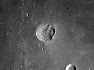 On the Mare Serenitatis surface near Posidonius crater is a notable system of wrinkle-ridges that parallel the nearby shore. These are designated the Dorsa Smirnov. At the peak of these ridges is a small craterlet with a diameter of 2 km. This craterlet is surrounded by a patch of high-albedo material, and is an example of a lunar bright spot. This peak was formerly designated Posidonius Gamma. The Posidonius Gamma feature was first observed by the lunar cartographer Julius Schmidt in 1857. He noted the similarity to the bright patch surrounding Linné crater. 2005/09/22 & 2005/11/20. C14 @ F41. LU075M.