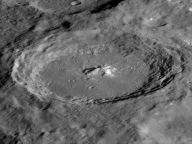 Ptolemaeus is well-known and ancient impact crater close to the centre of Moon. The features of Ptolemaeus are highlighted when the sun is at low angles during the first and last quarter. The crater has a low, irregular outer rim that is heavily worn and impacted with multiple smaller craters. The rim has a discernable polygonal shape, although overall it remains circular. The largest of the peaks along the rim, designated Ptolemaeus Gamma (γ), has an altitude of 2.9km and is located along the northwest rim. The crater has no central peak, a lava-flooded floor, and lacks a ray system. Impact sites of this form are often classified as a "walled-plain", due to their resemblance to the maria.