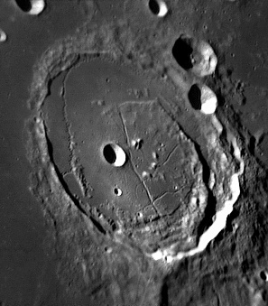 The floor is fractured by an elaborate system of rilles and contains three smaller craters surrounded by a symmetric darker halo. These dark-halo craters are cinder cone-shaped and are believed by some to be volcanic in origin, although others think they were caused by impacts that excavated darker mare material from underneath the lighter lunar regolith.
