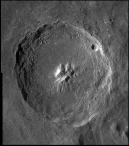 Its inner wall is slumped and terraced, sloping down to a rough but nearly flat floor exhibiting small, knobby domes. The floor displays signs of past volcanism, most likely from rock melt caused by the impact. Detailed photographs of the floor show that it is covered in a criss-crossing array of cracks and small hills. The central peaks rise 1.6 kilometers above the floor, and a lesser peak stands just to the northeast of the primary massif.