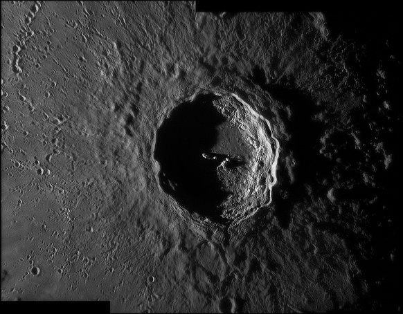 Copernicus Sunrise. One of the most prominent and spectacular of all lunar craters. It is 93km wide, and was formed around 800 million years ago. This view was obtained with the crater just emerging from the terminator. The spectacular view through the eyepiece prompted the only lunar image of this particular night. 2009/08/29. C14 & SKYnyx 2.0M.